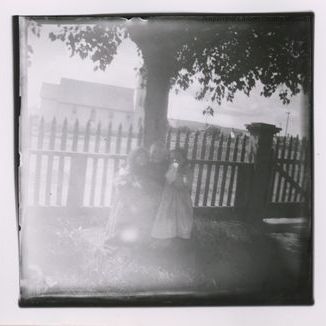 Update - 2009: Black & white contact print. Snapshot. Made from glass plate negative, Package 6, 166. Image of three children posed under a tree in a grassy yard. Picket fence behind. Dirt road, church & other buildings in background.
