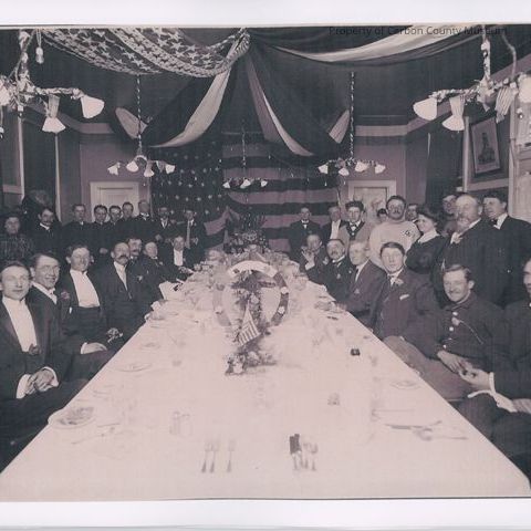 Black and white print. Snapshot. Image of a group of men seated and standing around a white cloth-covered banquet table. Table set with china and glassware, floral centerpieces with flags and three-colored ring. American flag in background with flag bunting draped from ceiling over light fixtures; another flag can be seen at left wall.