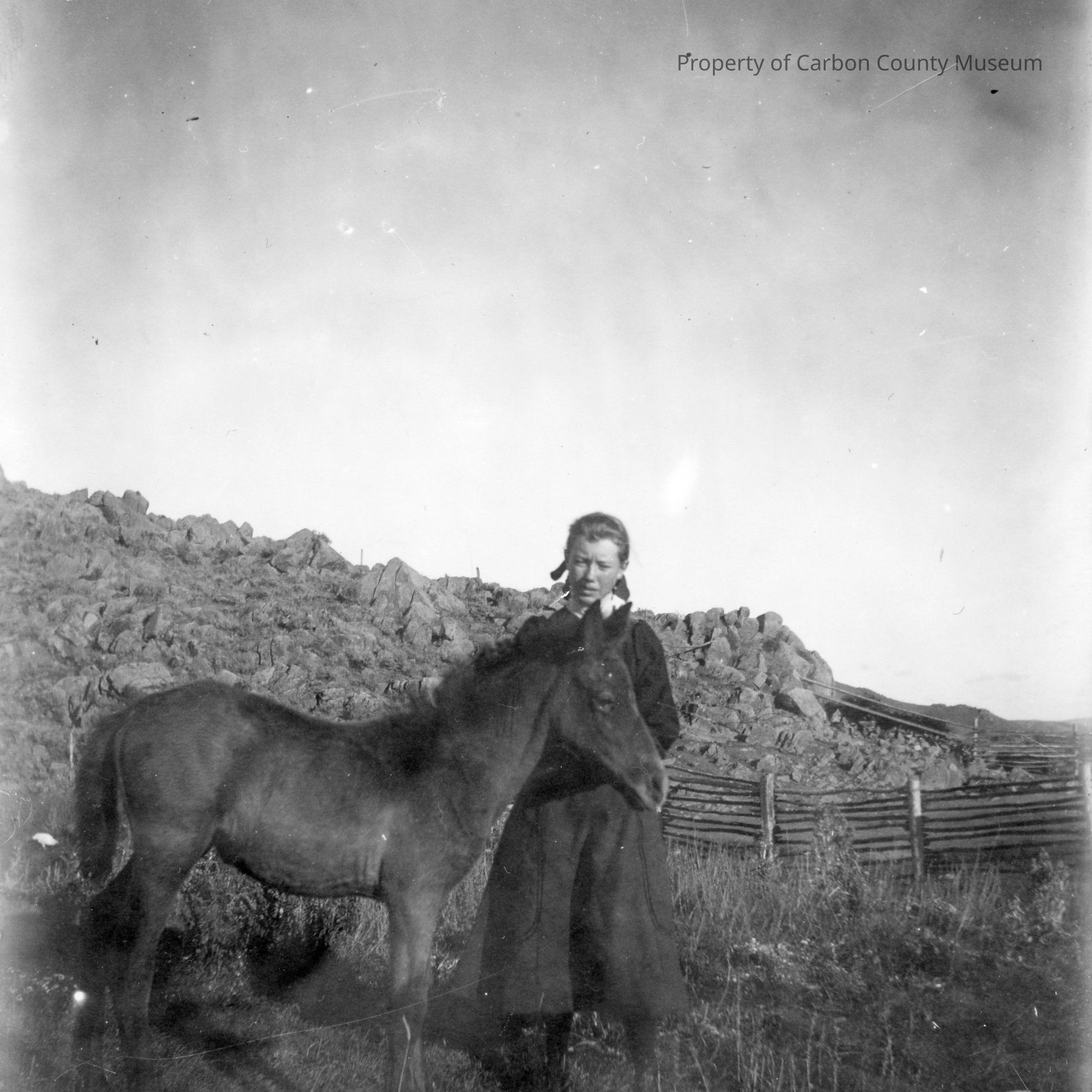Update 1/2010: Black and white contact print. Snapshot made from glass plate negative, Box 11 No 100. Image of a young girl standing behind the head and neck of a dark colt. Colt and girl are standing on a grassy area with a rail fence and rocky hill in the background. She is wearing a dark dress with a light collar. Her hat appears to be on the ground right.
