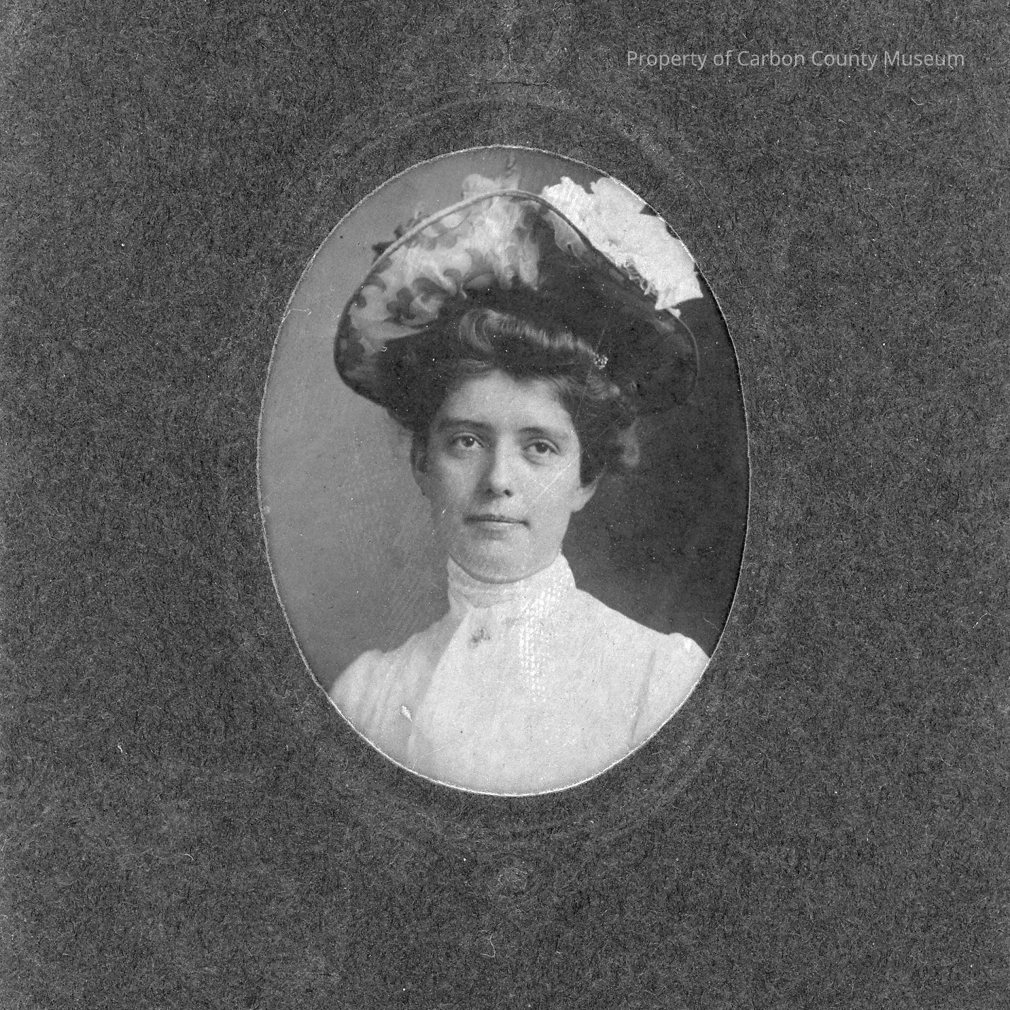 Update 1/2010: Black and white print. Studio portrait. Oval. Mounted on dark grey matboard with oval "frame" around image. Frame has crown at top and shield at bottom. Head and shoulders portrait of a young woman wearing a light colored dress/blouse with high collar. Her hair is pinned up and she is wearing a large patterned hat with light and dark ruffles on top.