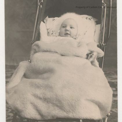 Update 2008: Black and white print. Studio portrait printed on postcard paper. Image of an infant tucked into a leather (?) cloth and metal stroller Infant is wearing a furry white bonnet and is covered by a fuzzy light colored blanket. Pillow with leaf pattern pillowcase under head. Patterned carpet on floor and painted backdrop behind.