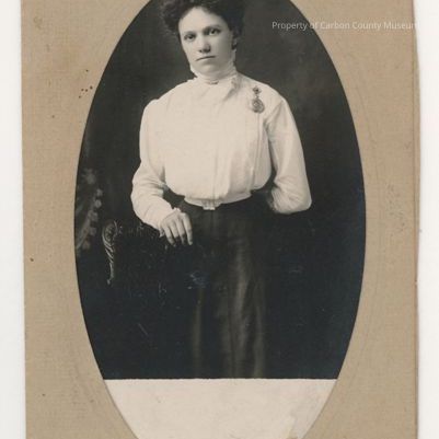 Update 2008: Black and white print. Studio portrait. 3/4 length. Printed on postcard paper and inserted into a patterned, tan paperboard mailing folder frame. Portrait of a young woman wearing a dark skirt, long sleeved white blouse with high collar and lace accents, and a white belt. A pocket watch broach is pinned to her left shoulder. Her right arm is resting on the back of a carved wooden chair. Her left arm is bent and held behind her back at waist. Her hair is pinned up. Wide white margin at bottom of image. oval opening and ornate "frame" in folder.