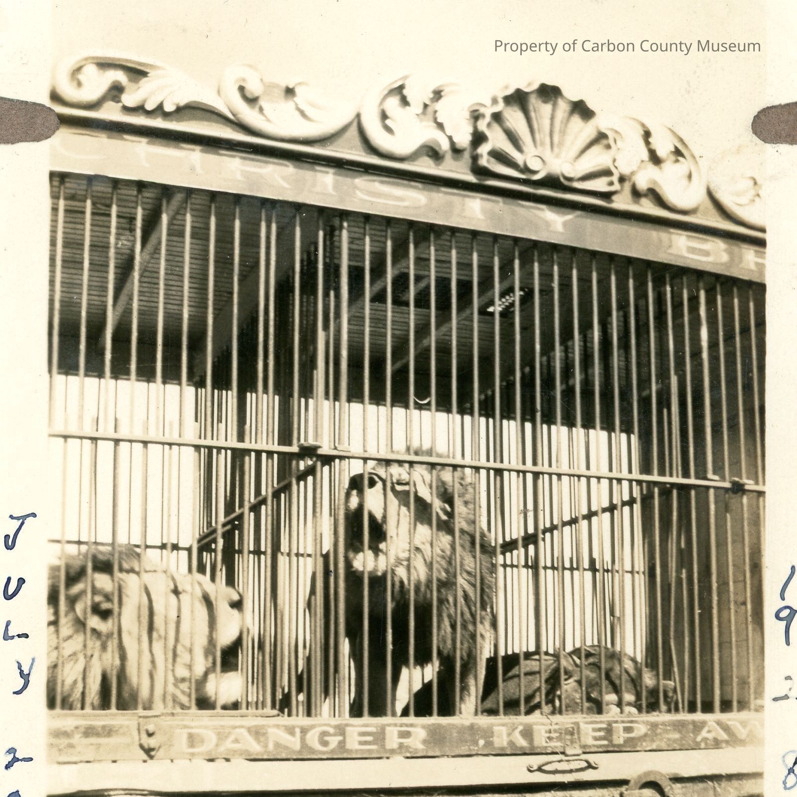 Black and white photograph. A two male lions are in adjoining cages, they are in the middle of a roar, text below the bars reads "KEEP AWAY". Written along the top edge of the photograph is "RAWLINS", written along the bottom is "LIONS", written vertically along the left is "JULY 22", written vertically along the right is "1928". Printed on the reverse is the number 28, also present is a circular green stamp that reads "MEYERS PHOTOS PHOTO FINISHING RAWLINS, WYO".Collection