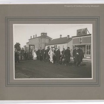 Black and white print on gray matboard with a darker gray decorative border surrounding print on mat, 8 x 10 by the Ferris Studio of a Shriner's parade of men in various costumes. Men in front of parade are wearing dark pants and long coats. One has a dark derby hat and one is wearing women's fancy hat with flowers on the brim. In the third row the man on the outside of row is wearing a Knights Templar fez and several other men all wearing women's hats. A man in the center frow has a white woman's dress over his pants and jacket, and a dark flat type brimmed woman's hat on his head. His right leg appears wrapped in a bandage. There is a man in a nightgown? with an apron over it, and a stocking cap on his head. At the end of the procession is a glass? and chicken wire enclosed booth with what appears to be someone seated in it, men and boys are walking to the side of it. A large tank with men seated on the top of it are at the end of the ling. The Carbon County Courthouse is in back of the photo with its three chimneys and widow walk showing on roof. The Mattas Saddlery is in right foreground. The window of the saddle shop has "saddles" painted in window. There is a white wooden house between it and the courthouse. The men are marching up the dirt road in front of these buildings. The Ferris Studio, Rawlins, Wyo. is stamped into lower right corner.