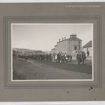Black and white print attached to a gray matboard, 7 3/4 x 10, it has a darker gray decorative border printed over the mat surrounding the print. The photo depicts a large Shriners parade with two men leading the group dressed in dark pants and Shriner fezes on their heads. The man on photo left is wearing long black coat and the man on right is wearing a regular dark suit jacket. Behind them is a band with primarily drums. These men and one boy are primarily wearing white spats except for one man, and they are all wearing dark colored fez type head wear. The long line of men and others extends into the photo's left horizon. They are parading up the dirt street along side of the Carbon County Courthouse on the right side of the photo. The two story sandstone structure has three chimney's on the back part of roof and a widow's walk on the front part of the roof with a pole extending up from the widow's walk center. A short sandstone retaining wall is seen on far side of street by parade route an din front of courthouse. At photo center right edge shows the corner of a white wooden house. Several houses are seen in distant horizon.