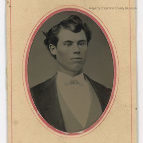 Black and white small oval tintype, 2 1/4 x 4 in an ivory matted frame with tiny red decorative line on edge of frame with tiny red matching Fleur de lis decoration in each corner. There is a tiny red border around the oval edge that surrounds tintype. The tintype is a portrait of young man with dark hair and eyes. His hair is parted on his right and swirled on his left forehead. A sprig of hair is sticking out on his right side. He is wearing a dark jacket with white high starched collar and grayish tone vest. Print has been tinted.