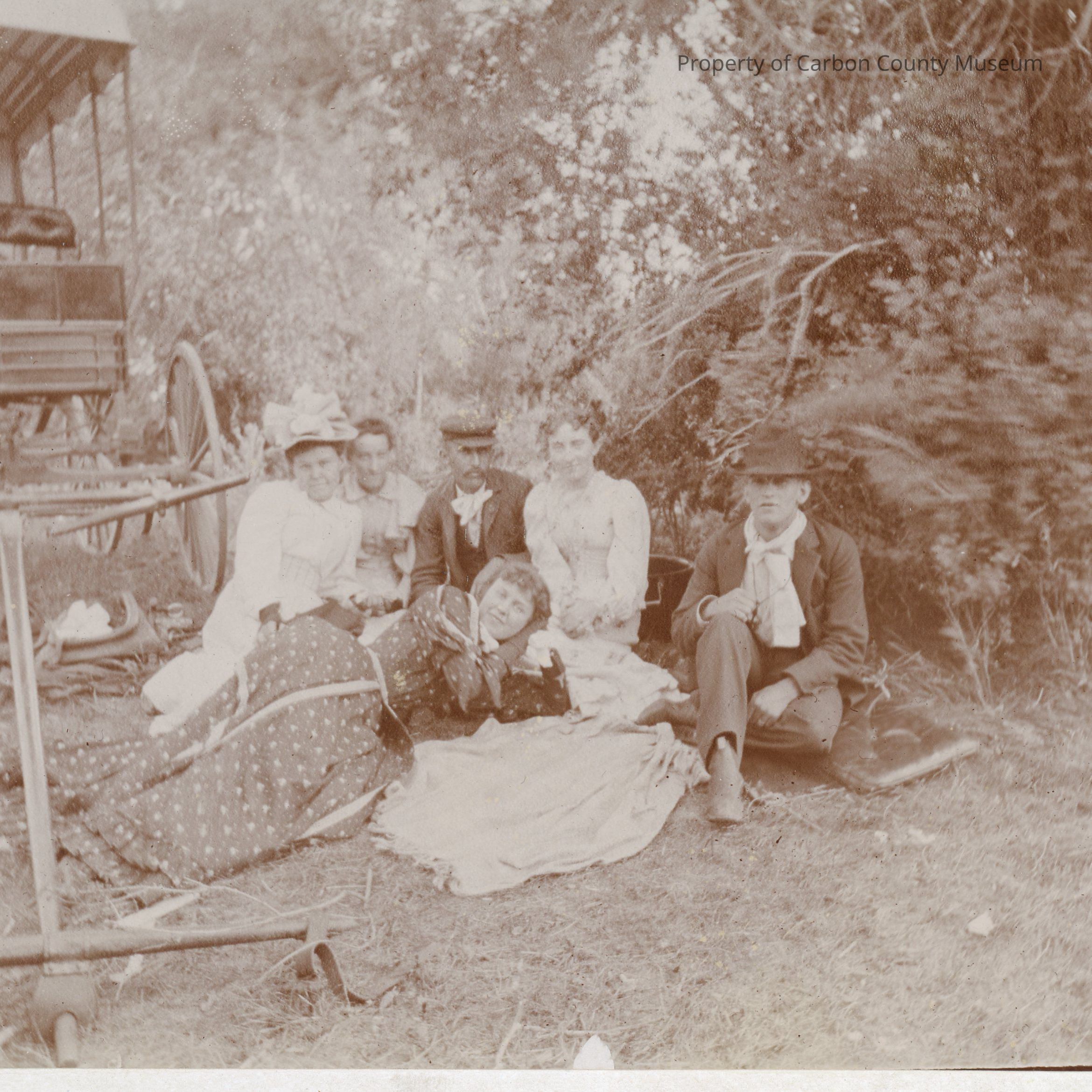Image is of two men & four women wearing vintage clothing with woman reclining together on the ground with trees & brush in the background, an unhitched buggy to the left of them. The buggy tongue is laying on the ground as are two horse collars. A white cloth is laying in front & between the people. Woman on side left is wearing an elaborate white hat. The foreground shows sparse vegetation. There are black lines on each side of image front from developing process.