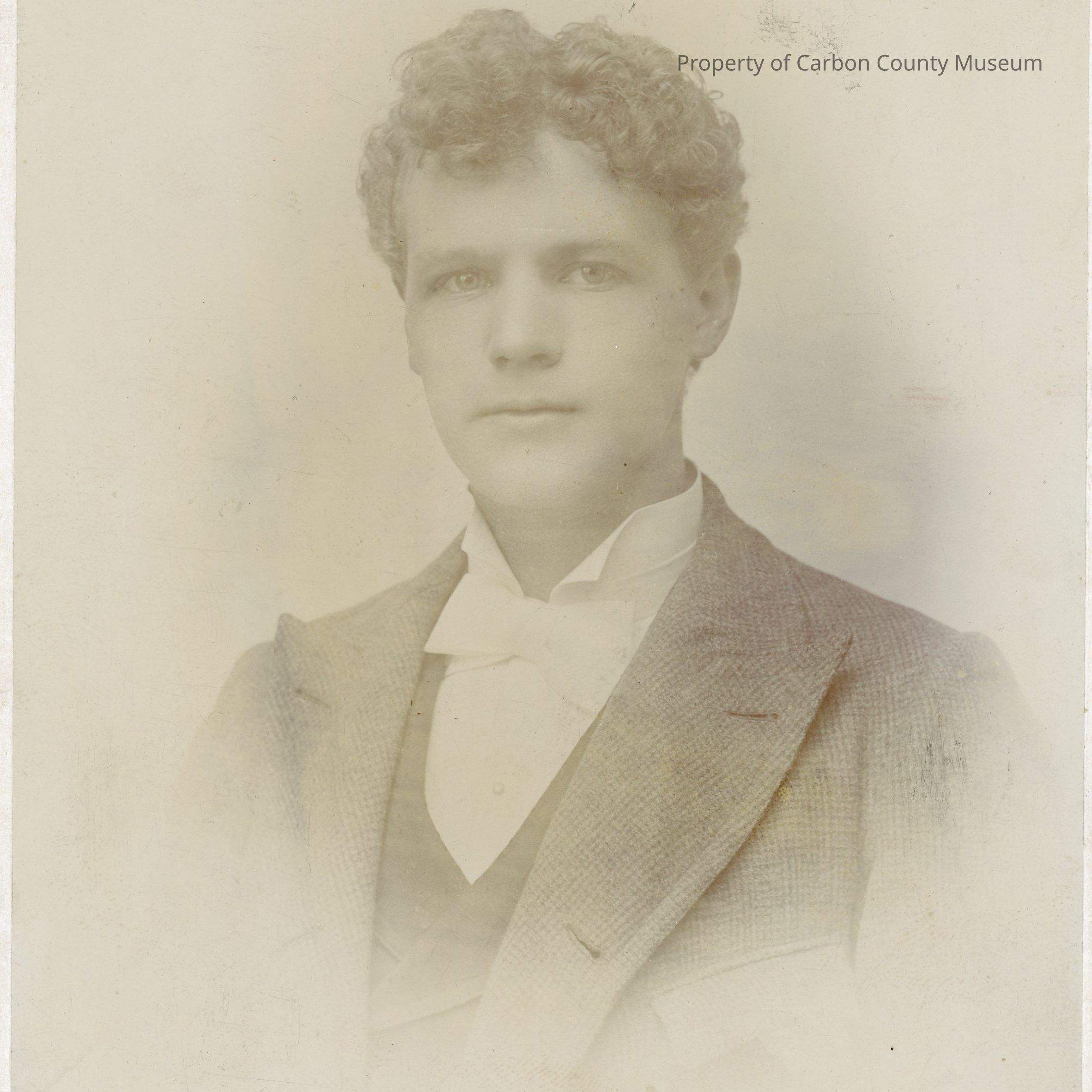 Update - 2009: Black & white studio portrait print attached to a cream colored mat. At lower surface "Brown" is printed in green, an ornate A is at center and Rawlins, Wyo is at right corner. A tiny decorative green border is at lower edge of print. Mat has a serrated effect around edges with square corners.
