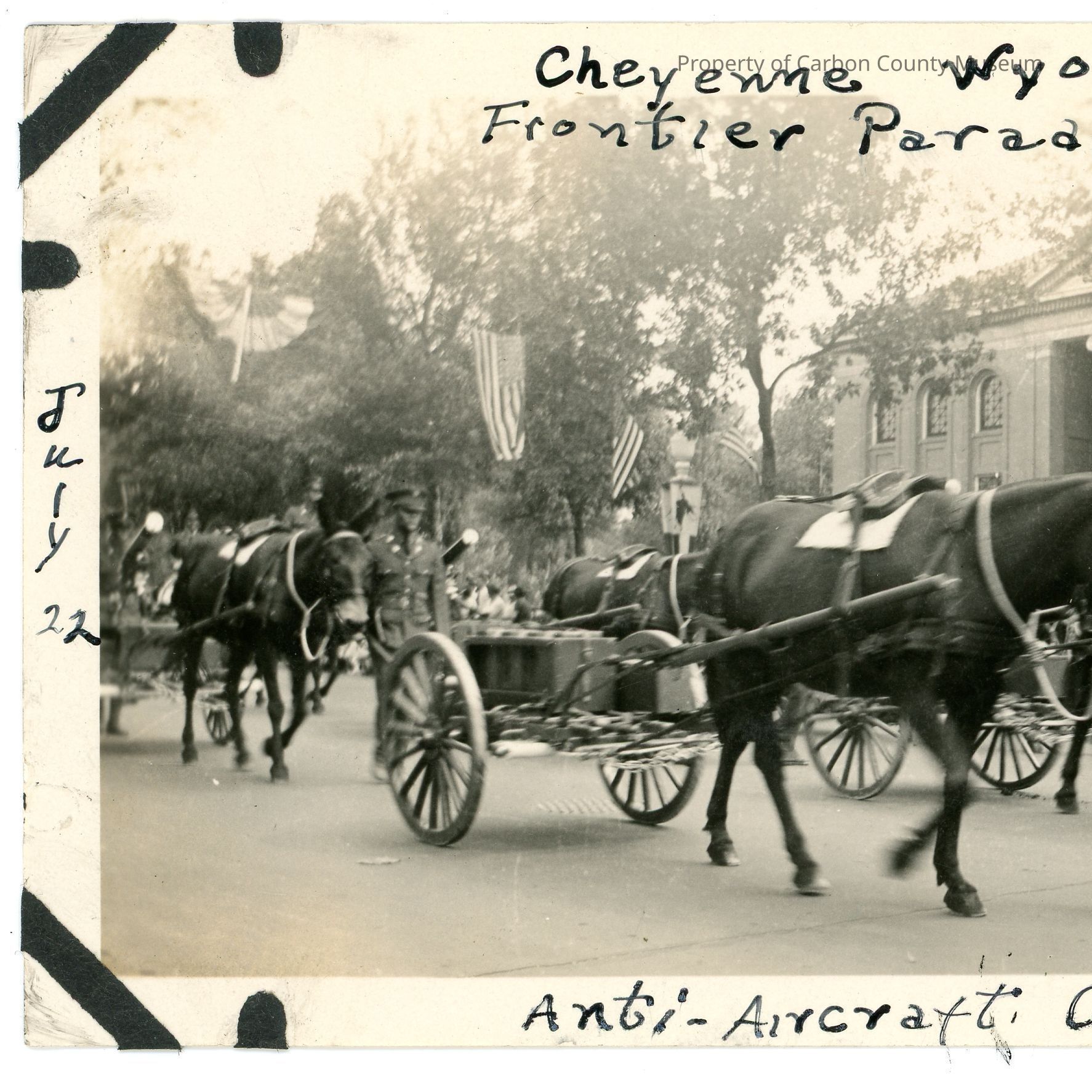 Black and white photograph. Uniformed men lead three horses pulling small wagons containing ammunition chests and large artillery pieces. Written along the top edge of the photograph is "Cheyenne Wyo Frontier Parade.", along the bottom "Anti-Aircraft Guns", vertically along the left "JULY 22", vertically along the right "1931". The number 2 is printed on the reverse.Collection