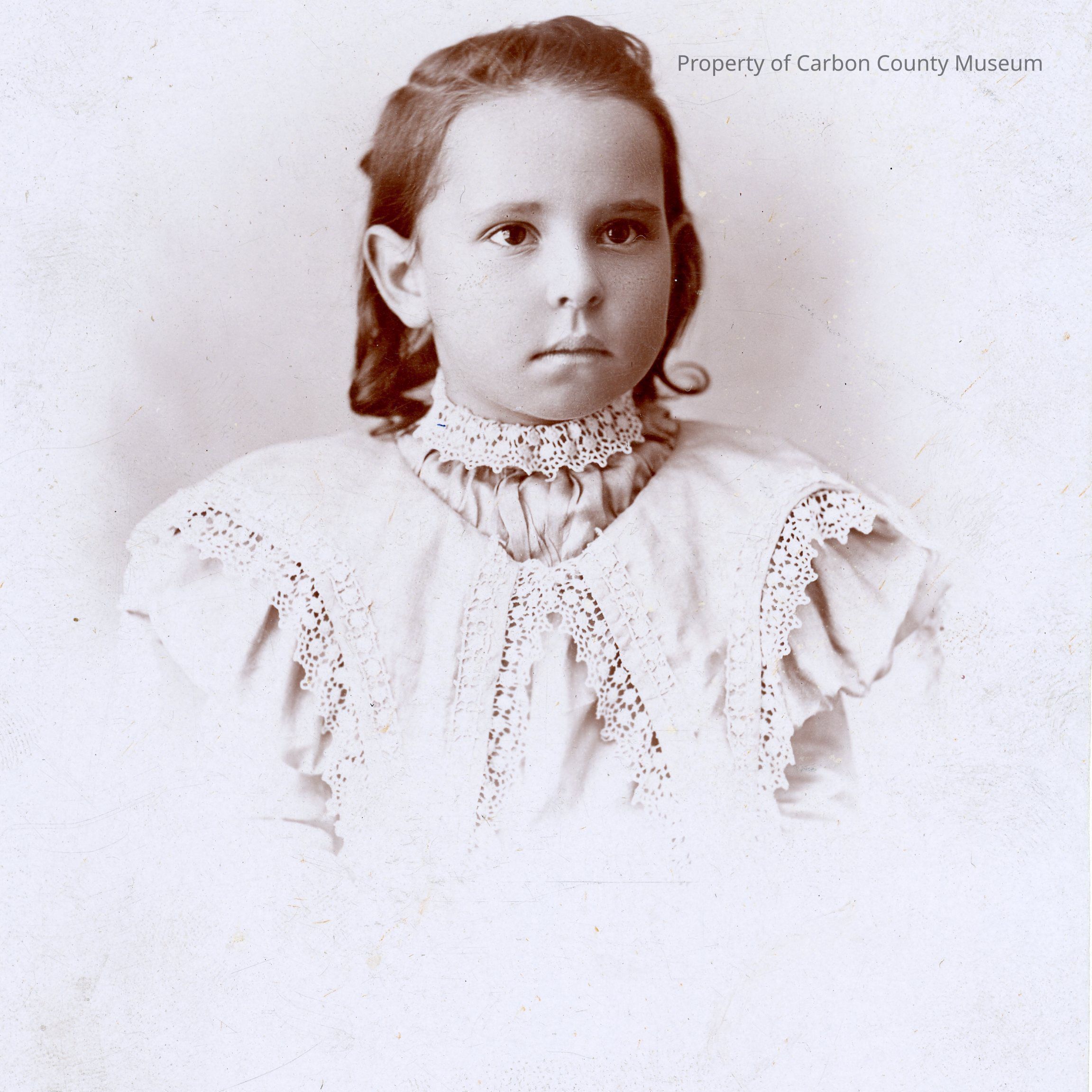 A girl in a white dress with lace around the collar and short, dark, ringlet hair.
