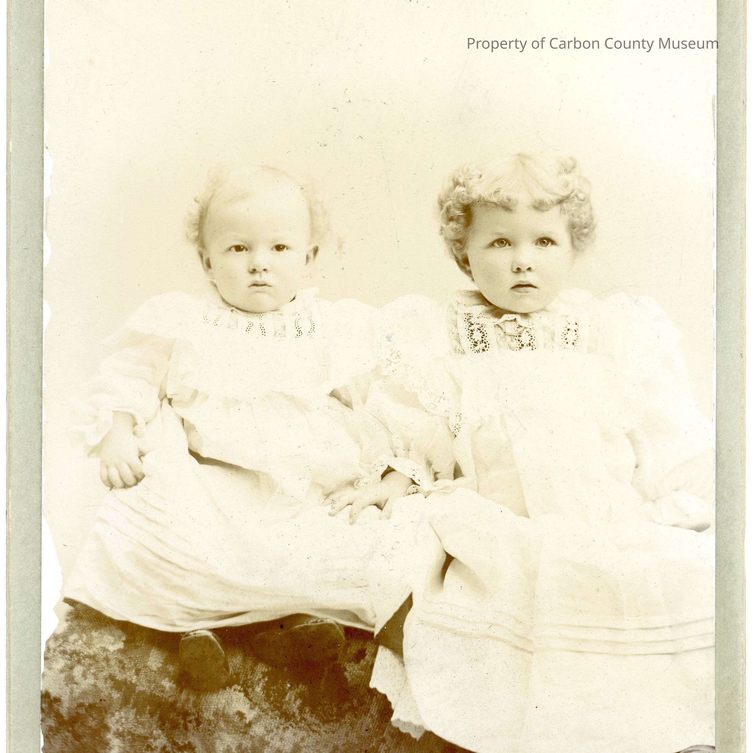Update 4/2010: Black and white print. Cabinet card. Studio portrait mounted on grey matboard. Full-length portrait of two children seated on an upholstered seat . Both are wearing identical white dresses with lace yoke and collar, lace sleeve caps and cuffs and horizontal pleats across skirt. Older child has short curly hair; younger child's's hair is still thin.