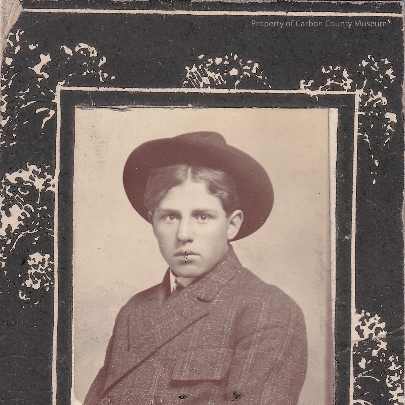 Small black and white photograph of a young man, pasted onto a green and white backing.