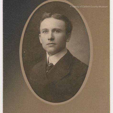 Black and white print. Studio portrait. Oval. Mounted on two tone, olive and black, matboard with lighter tan oval around image. Head and shoulders portrait of a young man dressed in dark suit, white shirt, with high starched collar and patterned tie. He has short hair parted in the middle.