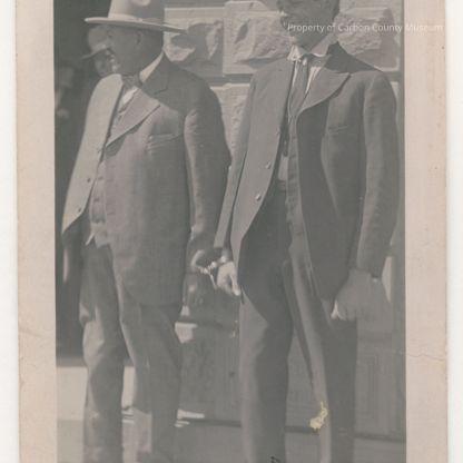Update 2008: Black and white print. Snapshot. Printed on postcard paper. Image of two men handcuffed together. Standing in front of a stone wall. Man on the right is dressed in a dark suit with vest, white shirt, dark tie and hat. Man on left is dressed in a medium colored suit, with vest, white shirt, bow tie and hat. Both men are smiling.