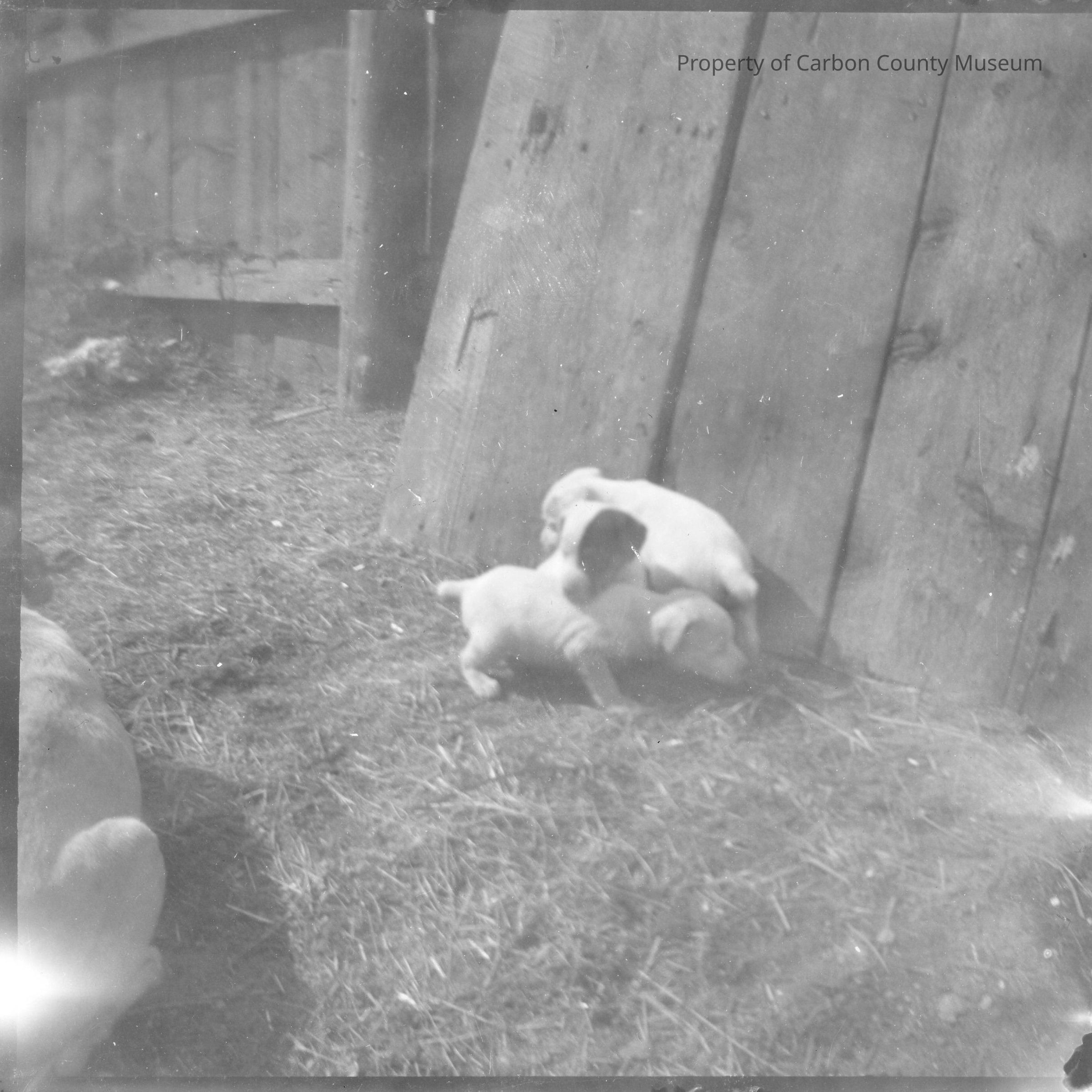 Update 2009: Two black and white contact print snapshots made from glass plates, box 1, #11. Image of three puppies playing on ground in front of board fence. Larger dog partially visible in photo left.