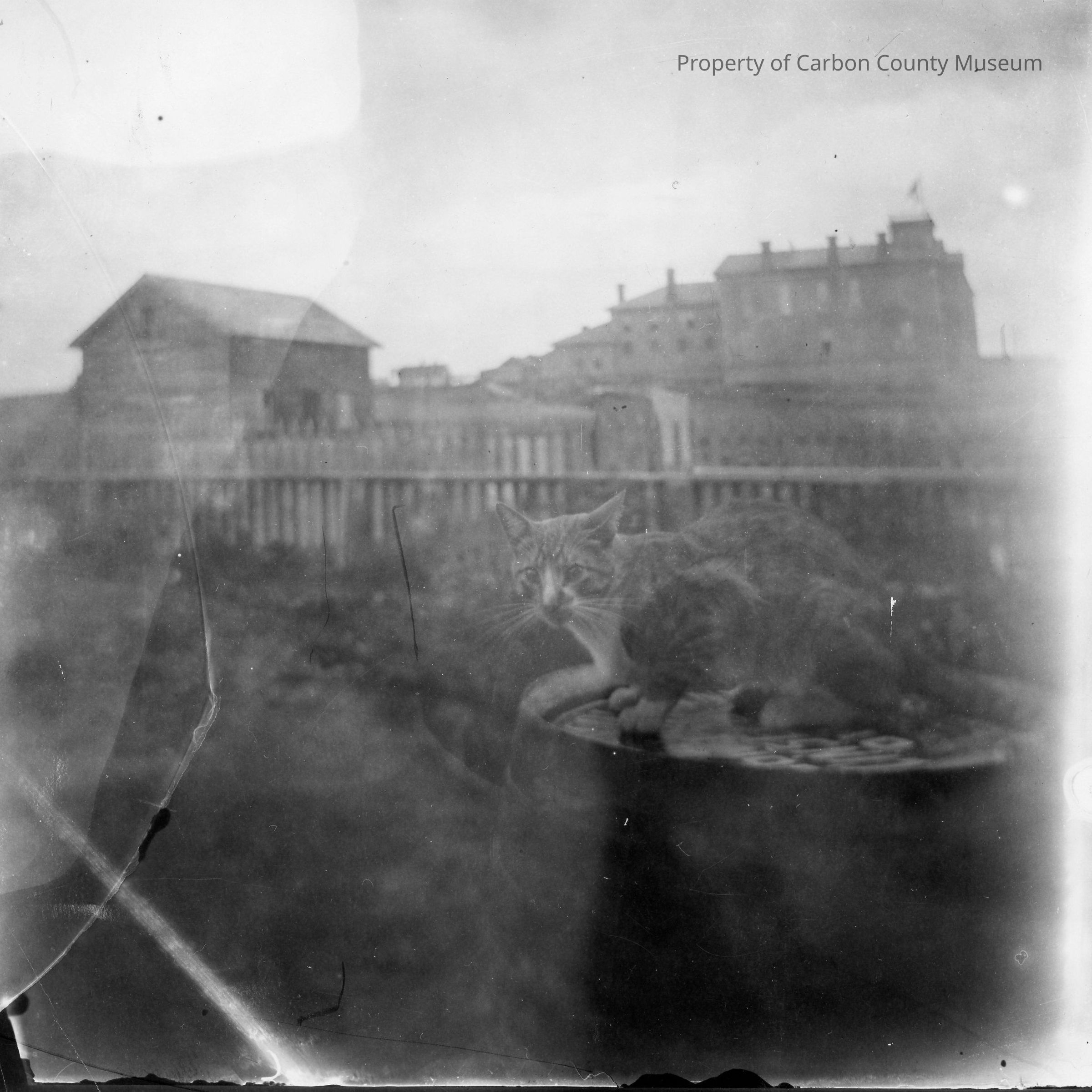 Update 2009: Black and white contact print of cat sitting on a barrel. Snapshot made from glass plate pkge 5, 145. A picket fence is across back yard. In photo background is the court house.