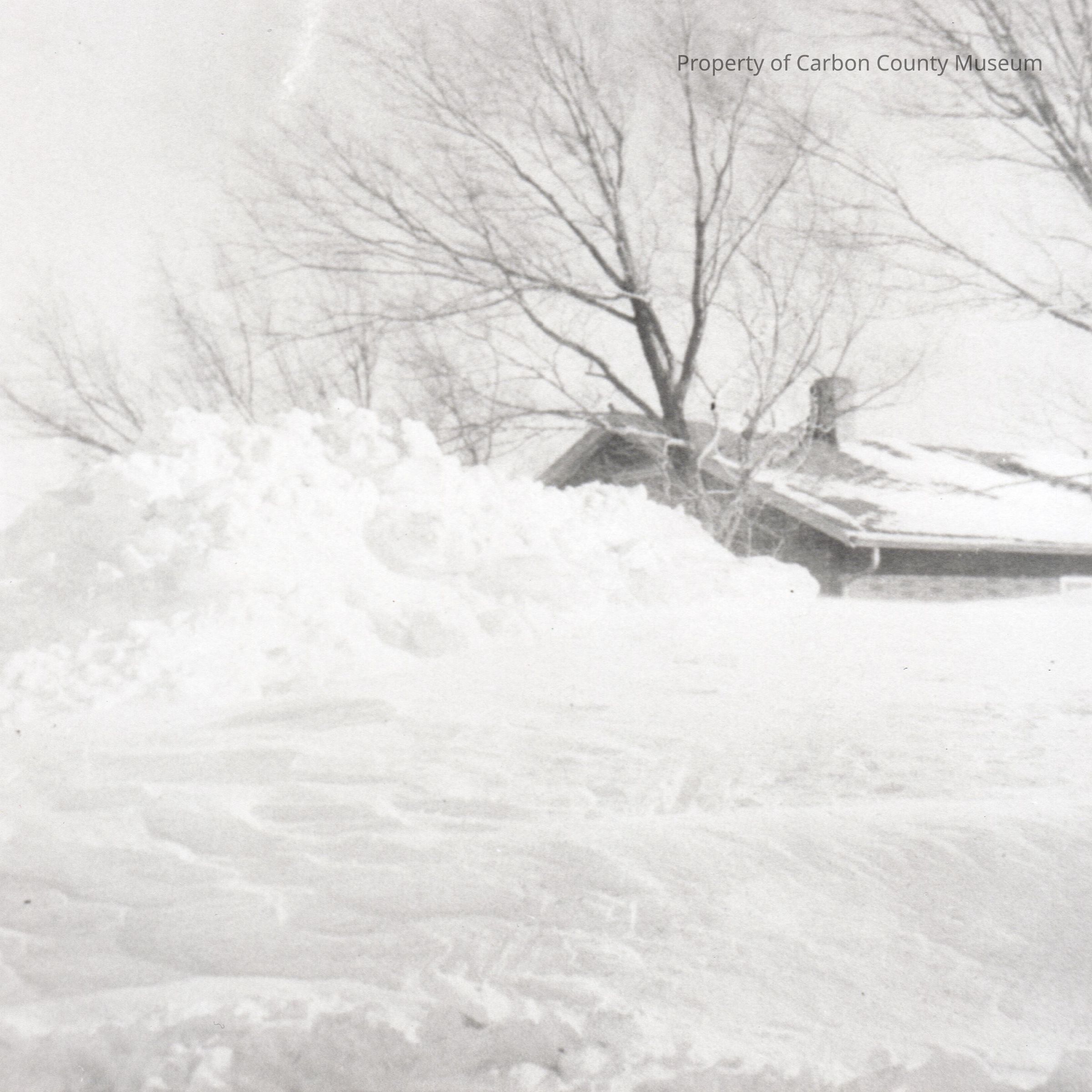 Black and white copy print. Snapshot. Image of the roof of a house and two bare trees peeking out from behind a massive snow drift. Blizzard of 1949.