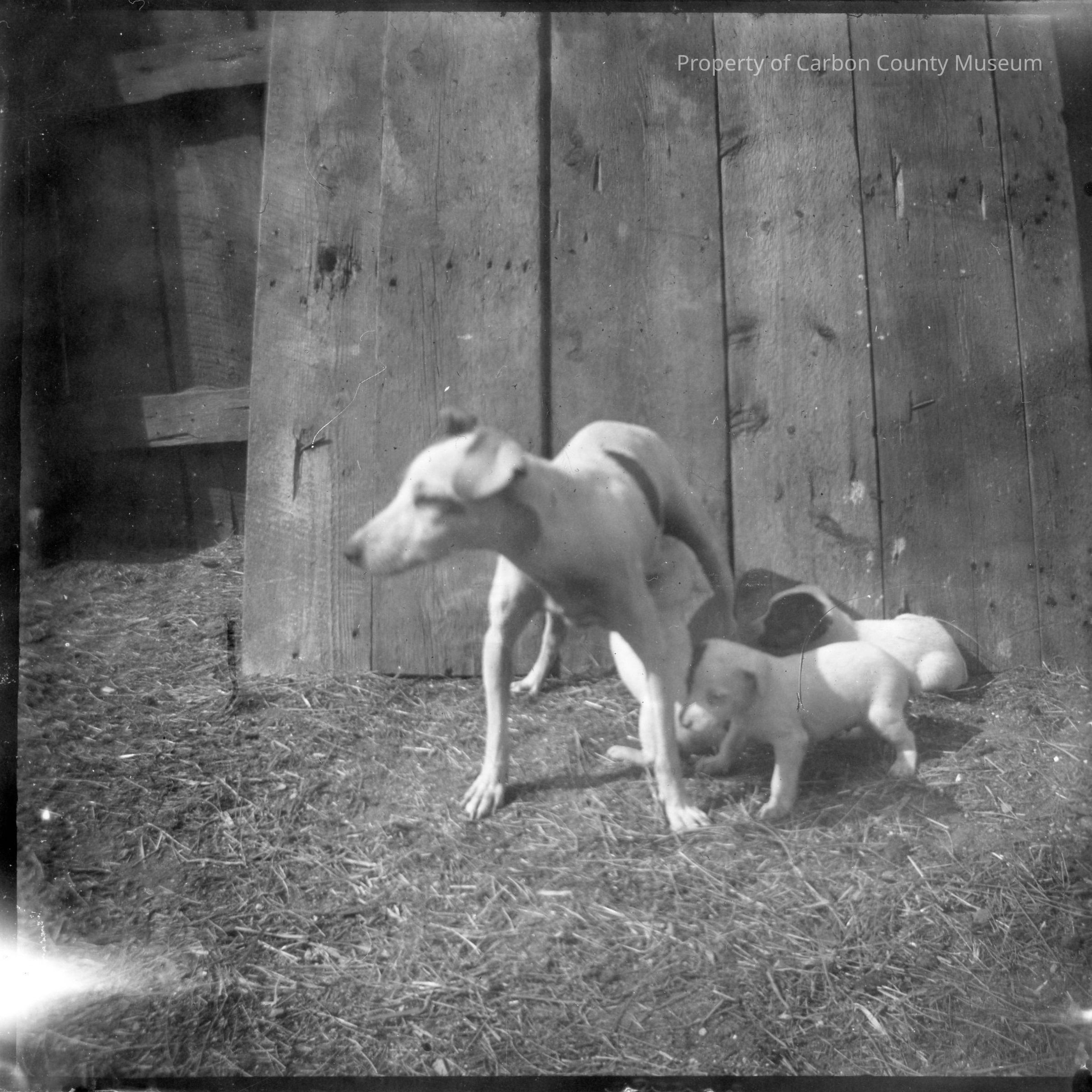 Two black and white contact prints made from glass plates, Box 1, 1. Snapshot of mother dog and three pups standing in front of wood fence. Mother dog is light colored with dark ears and spots. Pups are light colored, one has dark ears.