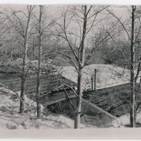 Black and white copy print. Snapshot. Image from above the rooftops of two large buildings seen through bare trees, nearly buried in snow. A bundled up person can be seen on the snow at left foreground. Bushes and trees in background.