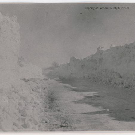 Black and white copy print. Snapshot. Image of a road cut between two massive snow drifts.