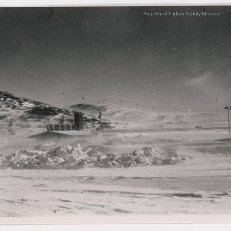 Black and white copy print. Snapshot. Image of the roof and sign of a motel building buried in a massive snow drift. Phone and power lines in background at right. Hill in background at left. Sign "Lodge" in front of brick chimney. Foreground is a mass of snow.