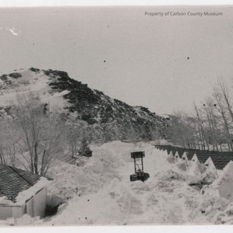 Black and white copy print. Snapshot. Image of a row of building roofs and two larger buildings buried in a massive snow drift. Peaks of the roofs at right are all that is visible; bare trees behind. Roof and part of one wall with trees behind and roof of a second building and trees are all that is visible at left. Hill in background. Snow clearing equipment at center between rows of buildings.