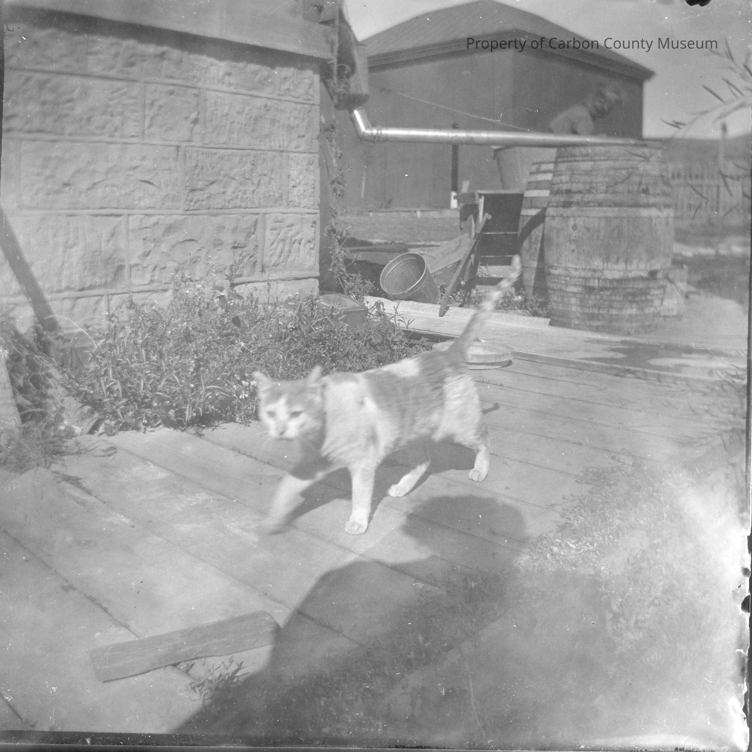 Update - 2009: Two original black & white contact print snapshots. Made from glass plate negatives, Box 1, No. 10. Image is of a light multicolored cat with it's tail up in the air walking on a wooden sidewalk next to the base of a sandstone foundation. Two barrels are seen in background with large pipe extending from house to top of barrel. the shadow of the person taking the photo is seen on sidewalk.