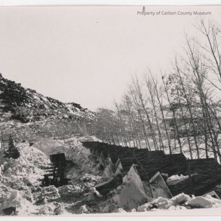 Black and white copy print. Snapshot. Image of a row of roof peaks buried in a massive snow drift. Top of a roof visible at left .Trees around rooftop and behind row of roof peaks at right. Hill in background. Snow clearing equipment and a person can be seen in the churned up snow at center.