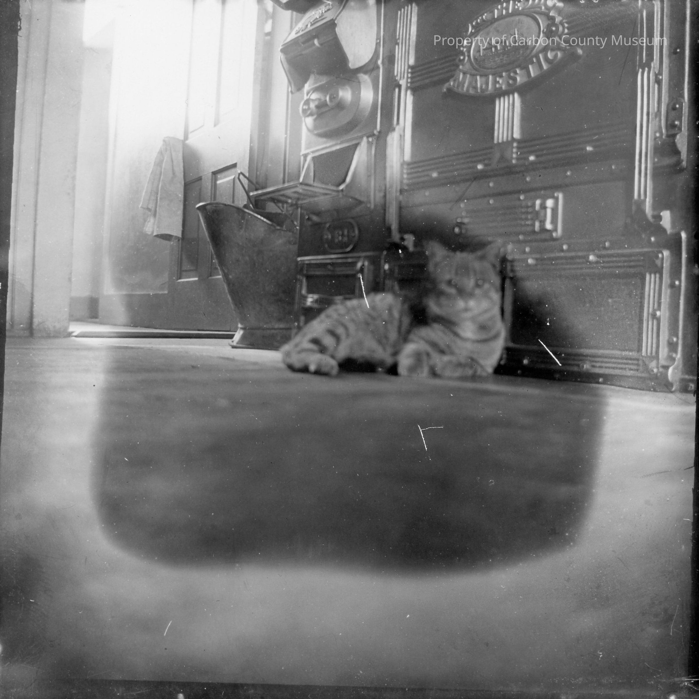 Update 2009: A black and white contact print snapshot made from glass plate negative Box 1, #6. Image is of a cat sitting on the floor in front of a cast iron Hot Majestic stove. A small door is open on stove on lower side left and a coal bucket is placed beside stove. A door with a dish towel hanging on the knob is seen at side left.