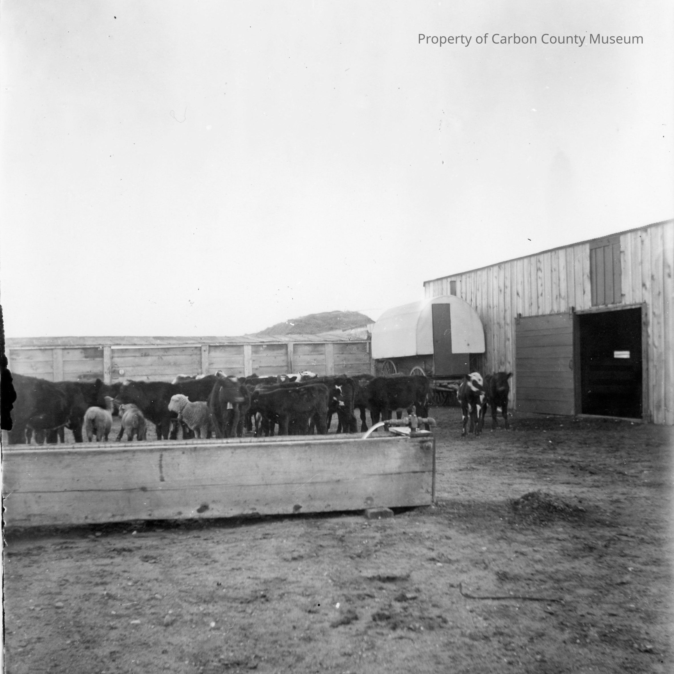 Sheep and calves in corral by barn. Sheep wagon in corner of corral.