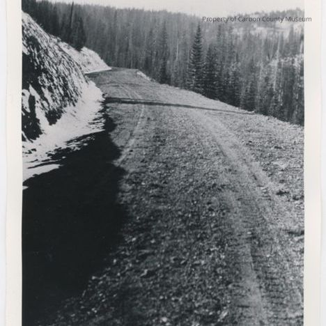 Black and white print. Snapshot. Image of a dirt road carved from the side of a mountain. Snow on hillside at left, evergreen trees on slope below right side. Forested hills in background with snow.
