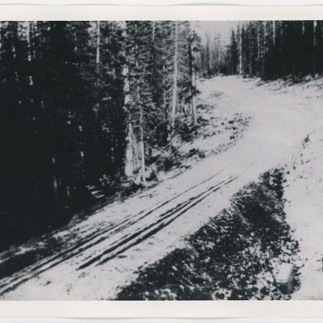 Black and white print. Snapshot. Image of a snow-covered dirt road curving through a thick forest.
