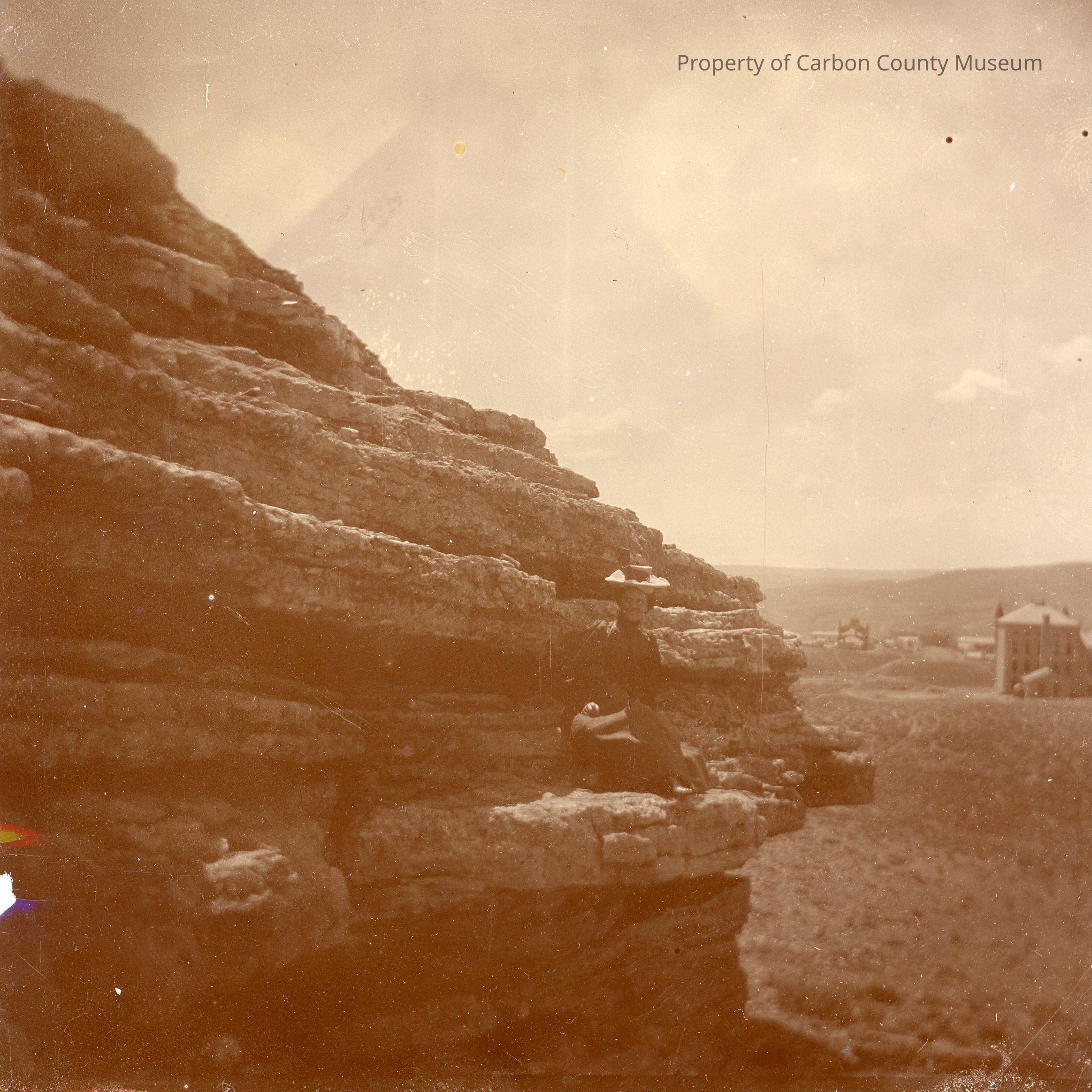 A lady wearing a hat sitting on a ledge or rock behind the Pen, Rawlins.
