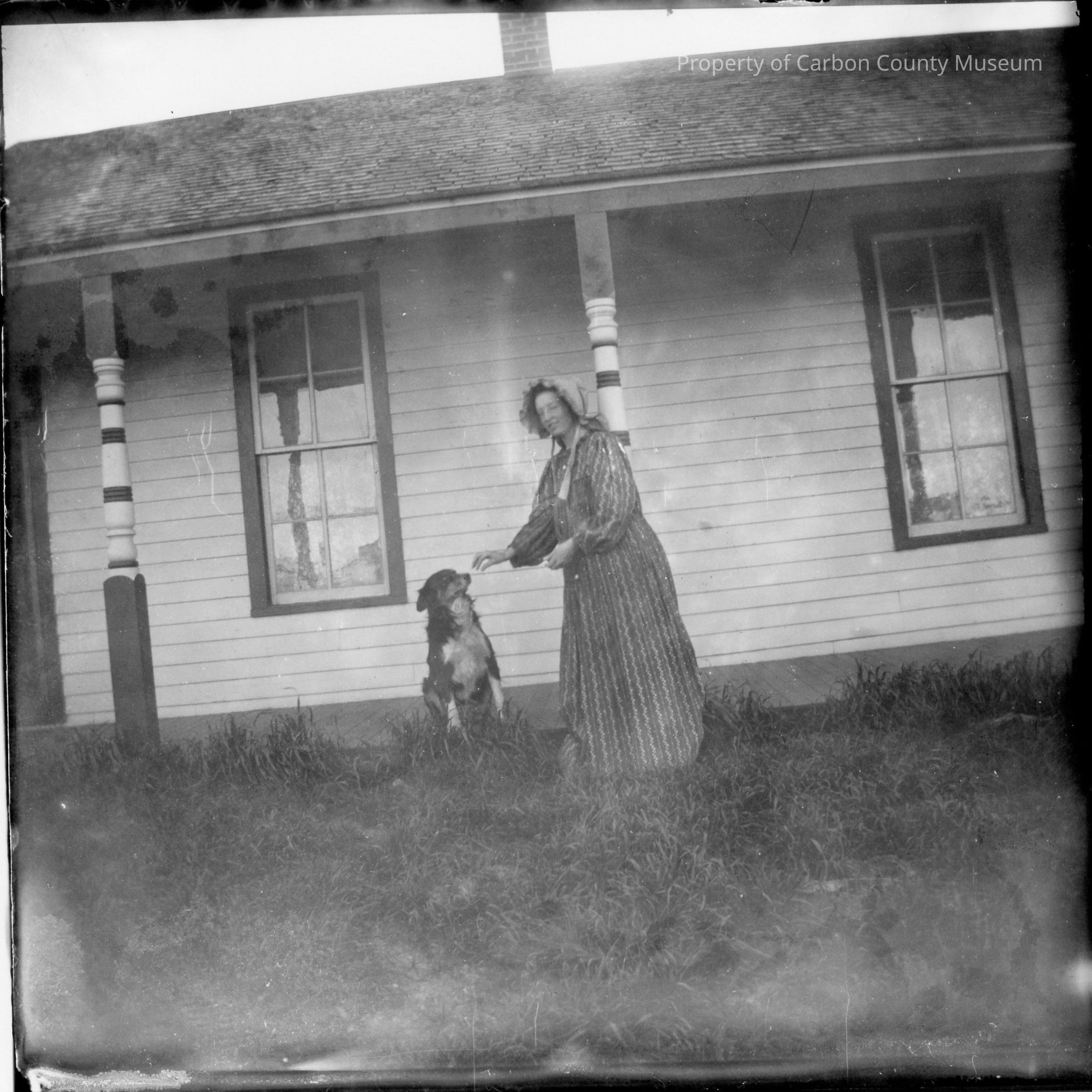 Update 4/2010: Black and white contact print . Made from glass plate negative Box 8, No 69. Snapshot. Image of a woman standing in the yard of a frame house feeing a dog. Woman is dressed in a long patterned dress and a sunbonnet.