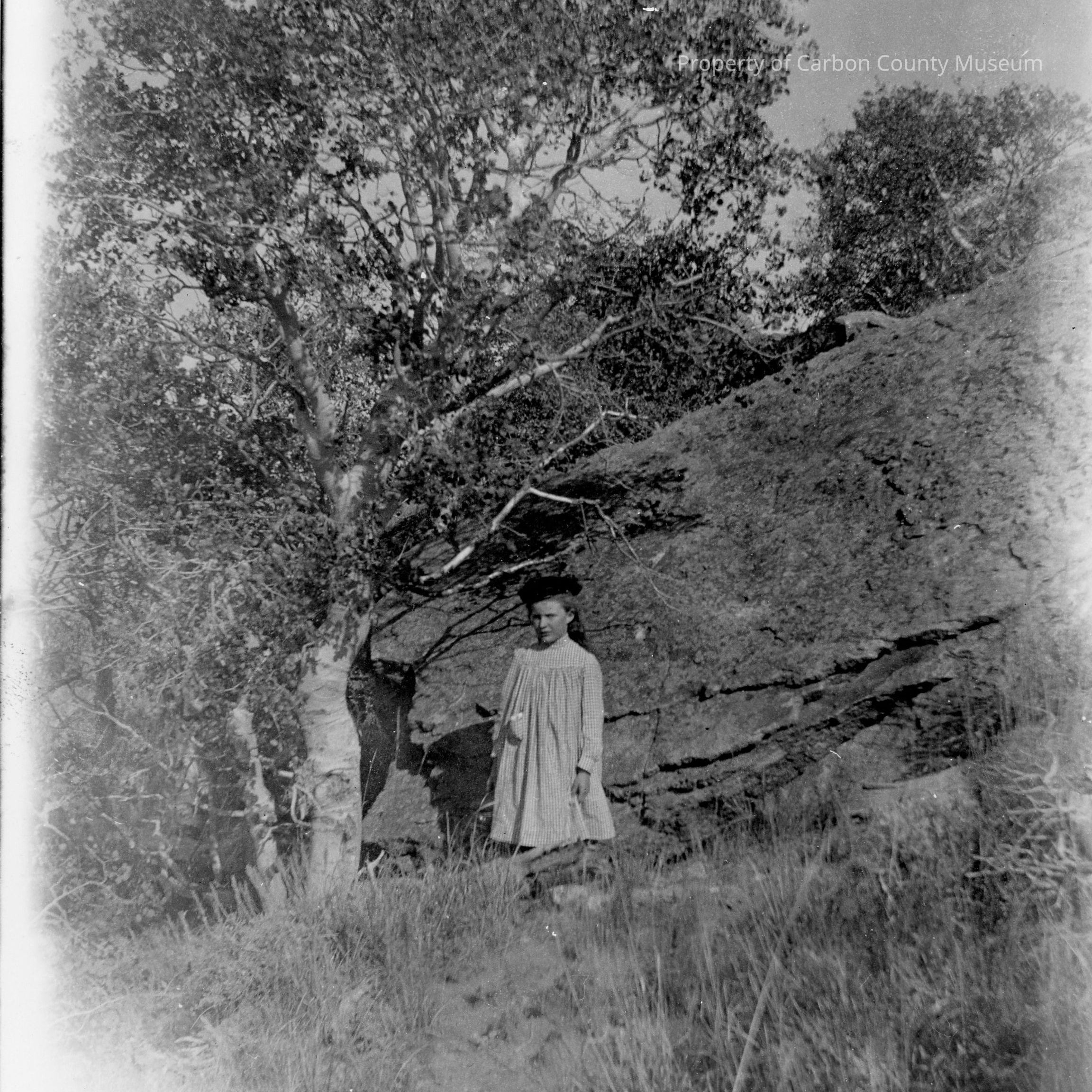 Update 2009: Black and white contact print. Snapshot made from glass plate negative, box 12, 108. Image of a young girl standing in front of a large boulder. Grass in foreground. Trees all around. Girl is wearing a light-colored sack dress and dark beret. Light around edges.