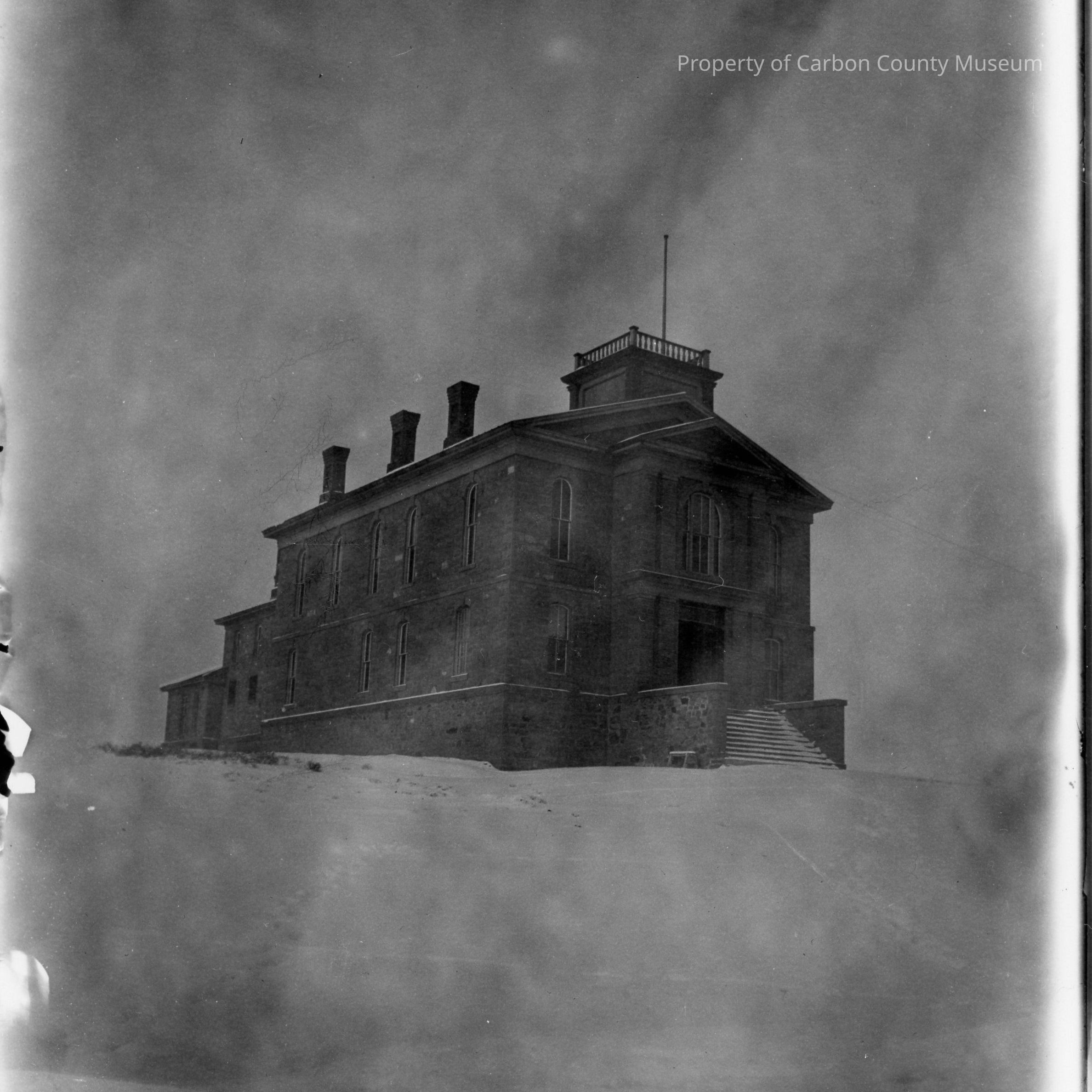 Update 2008: Black and white contract print from glass negative. Two copies. Image of a large two story stone building with open snow covered grounds. Raised foundation with front steps on short side. Square tower with fenced edge and lightening rod? above front doorway. Three chimneys visible. Stepped back sections off main building.