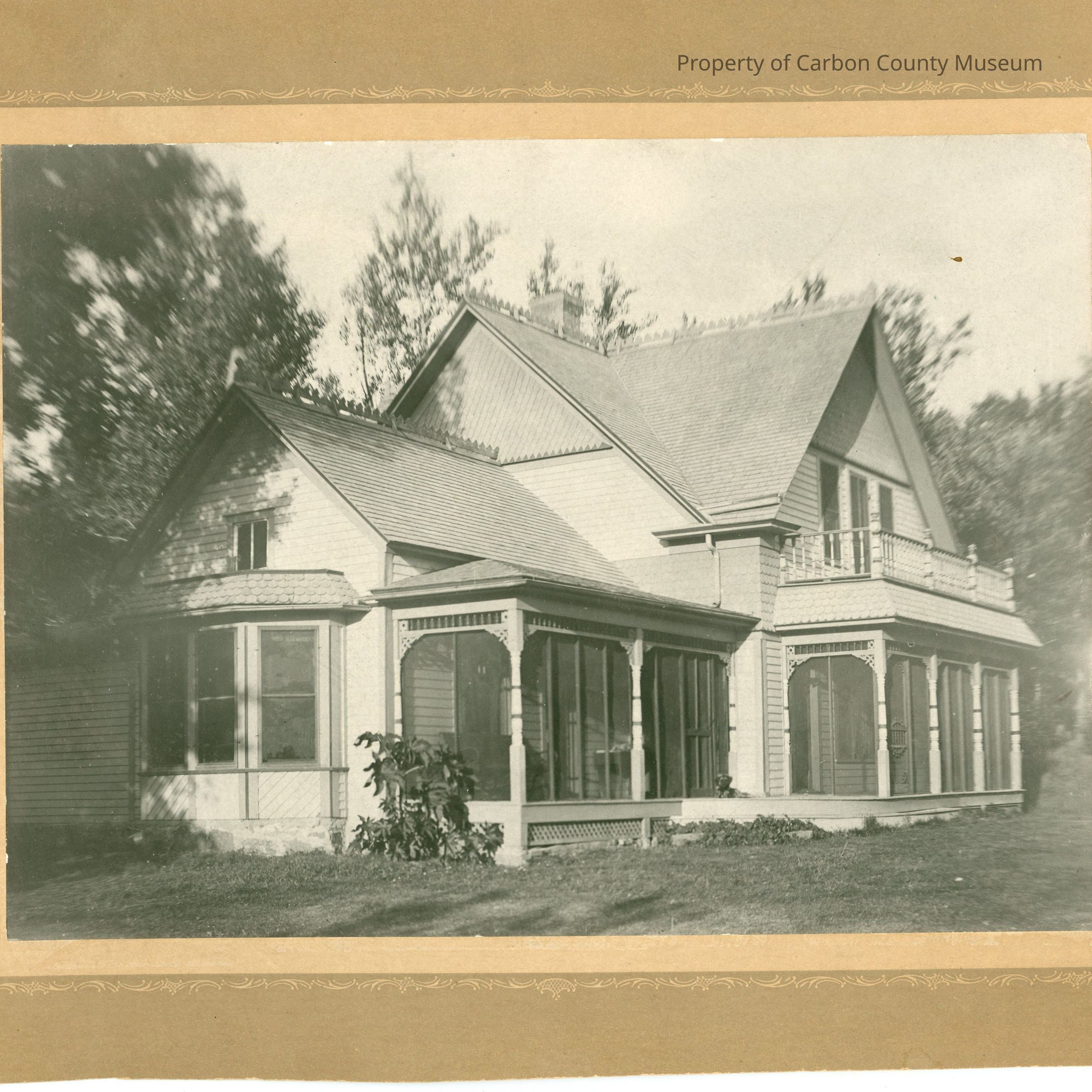 Mrs. Jungquist written on back. Window seat, windows on end, two screened in porches on front of house, two story, Rawlins.