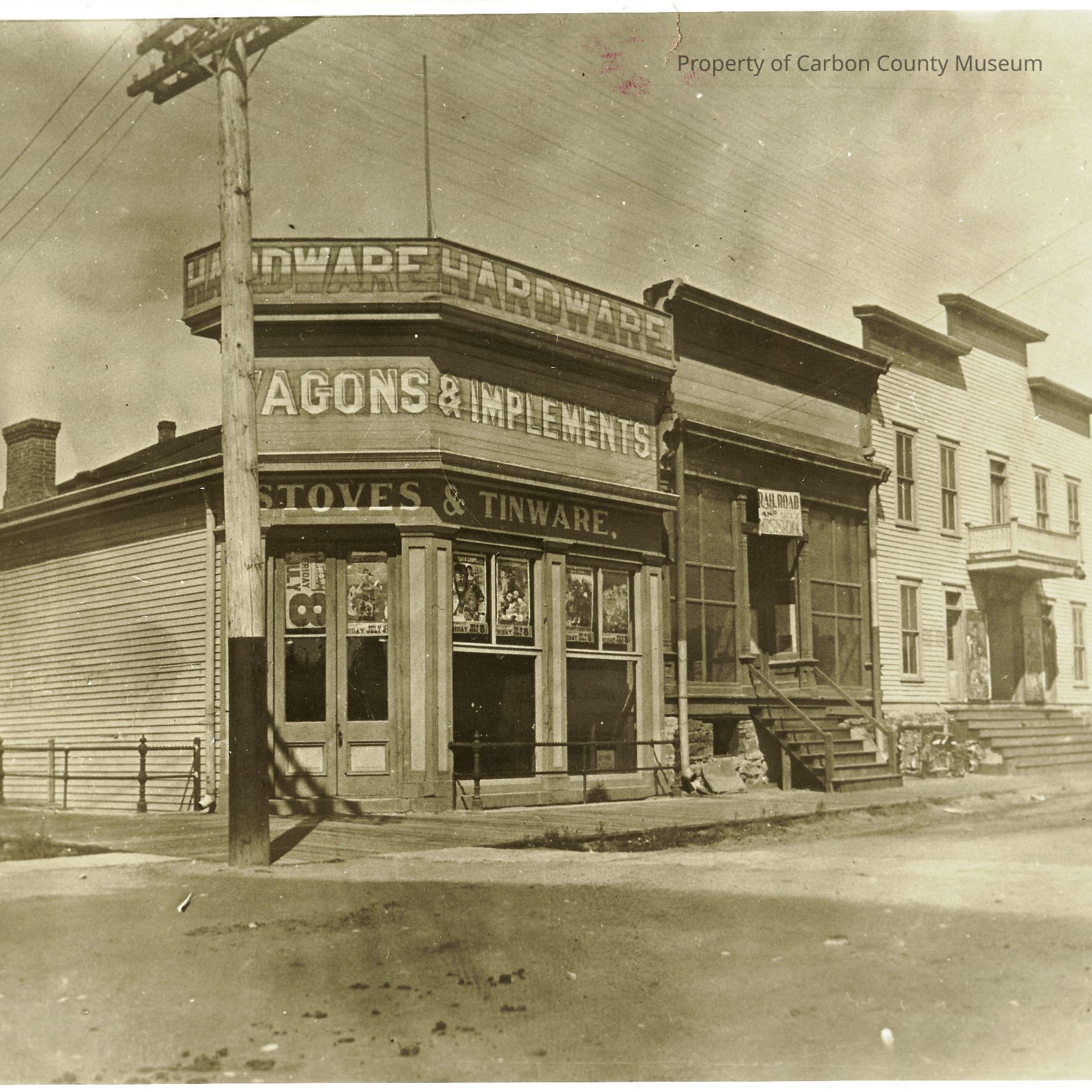 Update - 2009: Two black & white prints & one black & white copy print. Image of a dirt street with three joined buildings along it. view is of a corner property. Building at center of image has signage: "Hardware [twice on roofline]" "WAGONS & IMPLEMENTS" "STOVES & TINWARE" Second building has sign: "Railroad and city Mission" above door. Telephone pole at corner.