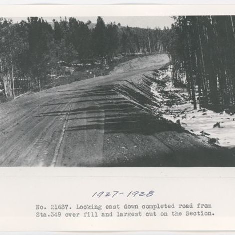 Copy of a print mounted to a page with black photo corners. Typed on page below photo: "No. 21637. Looking East down completed road from Sta. 349 over fill and largest cut on the section."