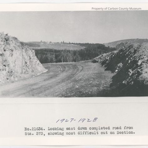 Copy of a print mounted to a page with black photo corners. Typed on page below photo: "No. 21634. Looking East down completed road from Sta. 373 showing most difficulty cut on section."