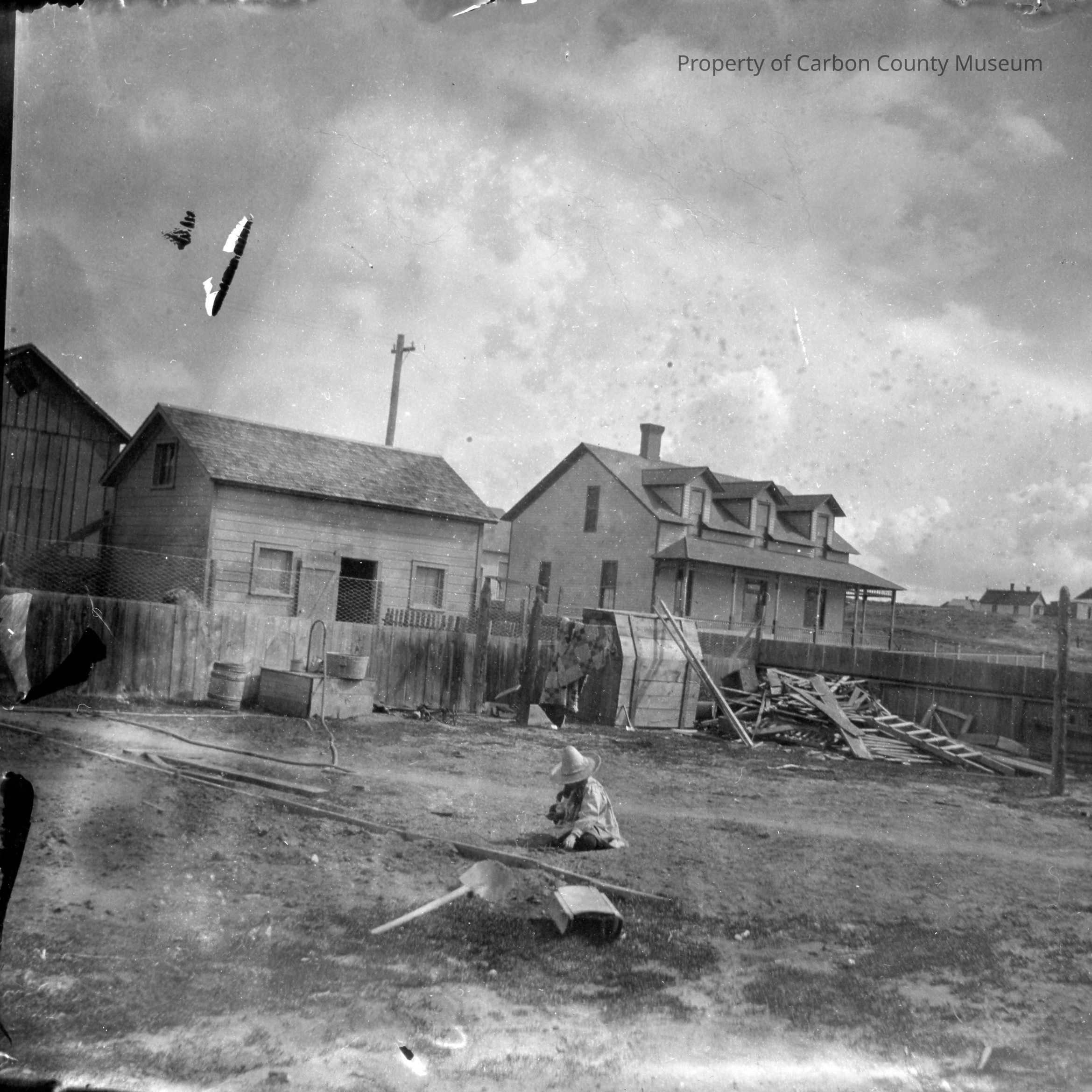 Update 1/2010: Two black and white contact prints. Snapshot. Made from glass plate negative package 5, No 154. Image of a dirt yard with a woman, child sitting in the dirt at center. A shovel and box in the foreground; boxes, barrels, tools and lumber inside a wooden fence in midground. Houses and other buildings in background. Person in yard is covered with long sleeved smock and large hat-unidentifiable.