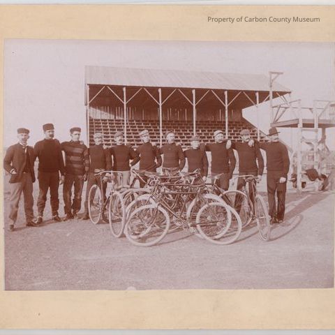 Bicycle Club taken at the grandstand, Rawlins. Bing Price, Ernie Durant, Frank Froling, Carl Bryant and others unknown.