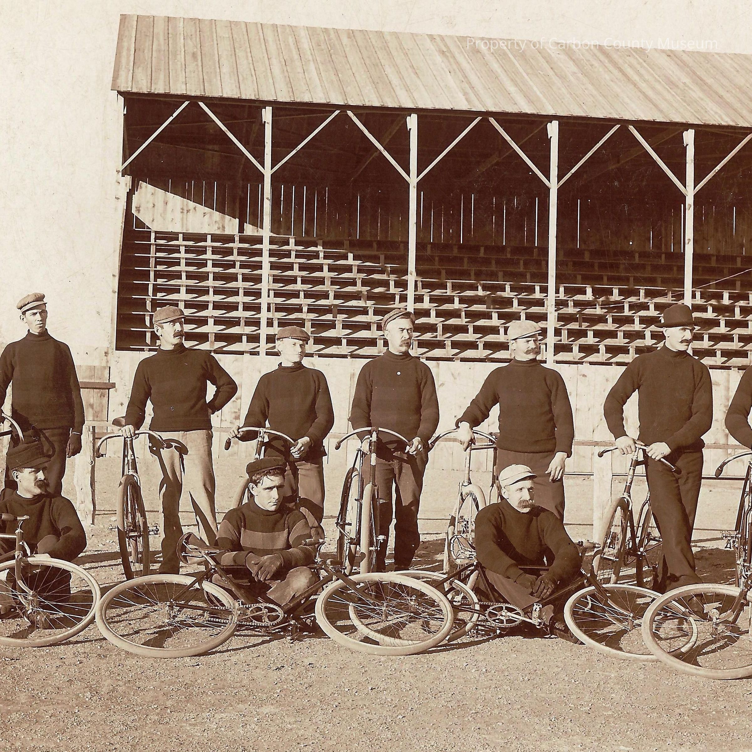 Bicycle Club taken at the grandstand, Rawlins. Eleven men unknown.