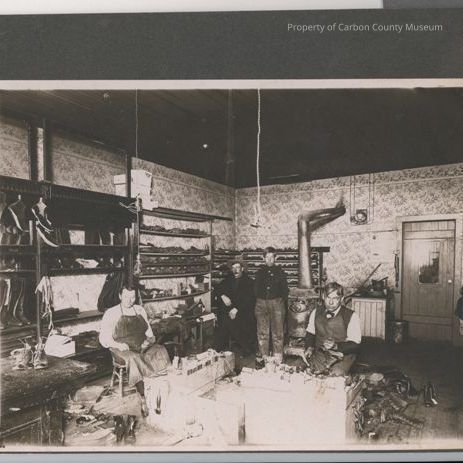 Update 2008: Black and white print. Mounted on black matboard. Snapshot. Image of four men inside a cobbler's shop. Two men in foreground seated at low tables with boxes and shoe lasts on top; each is wearing and apron an both are working on shoes. Along left wall are shelves of finished shoes and boots. Two men in background, one standing (young man) and one seated on a tall stool, are in front of more shelves with shoe lasts and beside a pot bellied stove. Counter with pair of boots at left foreground. Piles of boots on the floor at right.