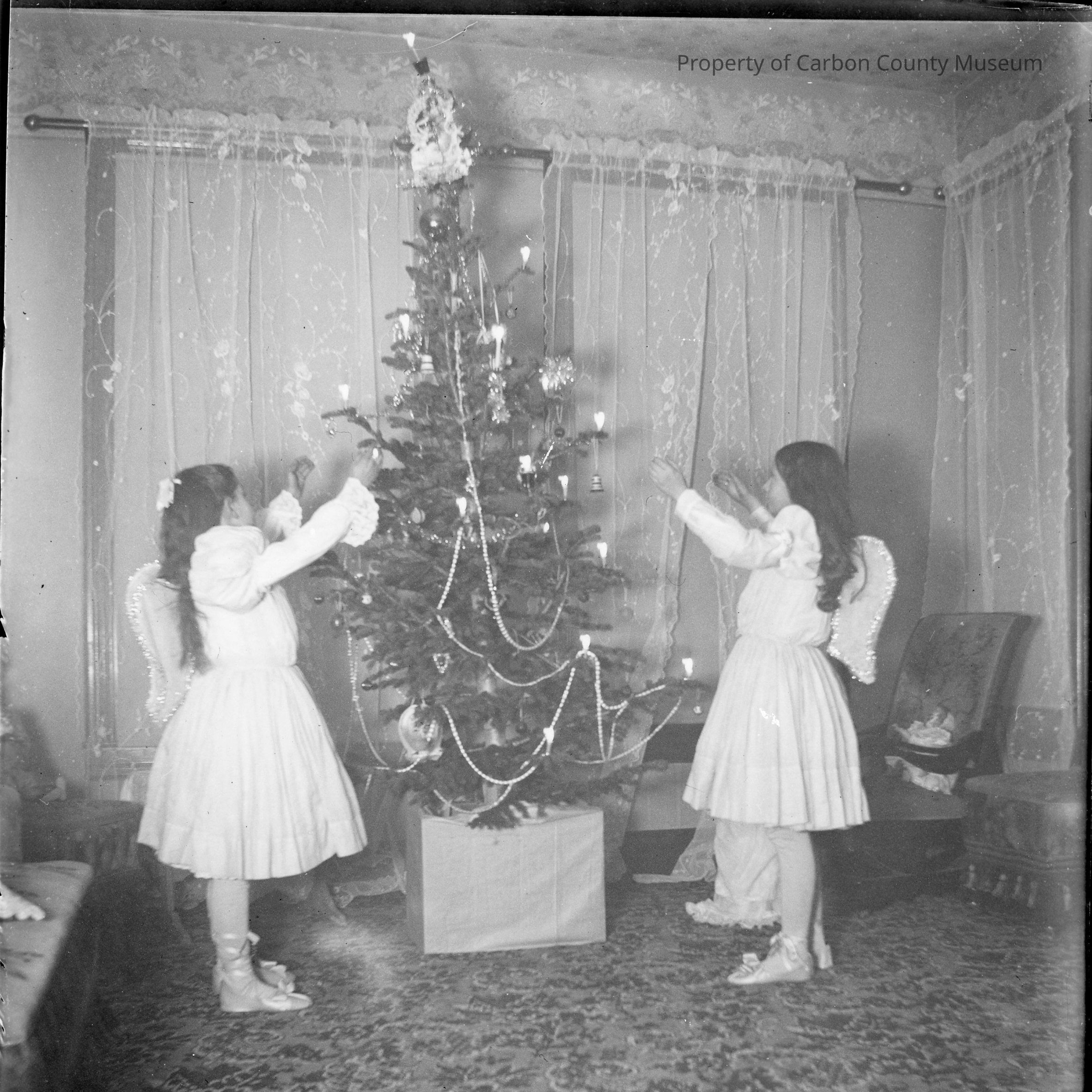 Image of two young girls in white angel dresses standing with arms raised on either side of a decorated Christmas tree. Two large windows covered with blinds and shear drapes in background; another similar window & two chairs at right; furniture at left. Patterned carpet on floor.