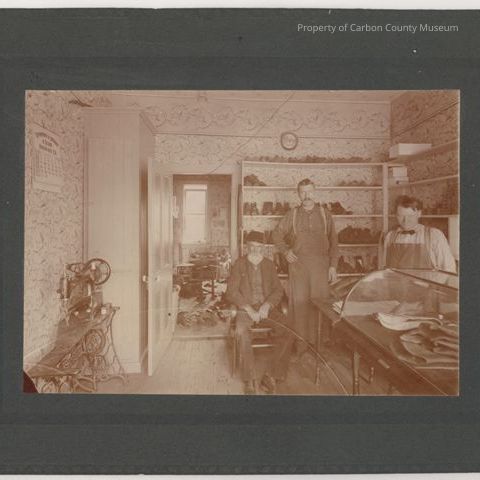Update 2008: Sepia print. Snapshot. Mounted on black patterned matboard with smooth "frame" around image. Image of the interior of a shoe shop with sewing machine along left wall and workroom in back. To the right of the open workroom door are shelves of shoes; to the left is a closet. Along right wall are shelves with boxes. At right front is a glass topped display case with table top. Three men, two standing and one sitting, at center of room. Seated man has grey beard and is casually dressed and wearing a suit jacket and cap. Standing man at center is wearing a dark striped shirt and long apron. Man standing at right is wearing a light striped shirt, bow tie and apron.