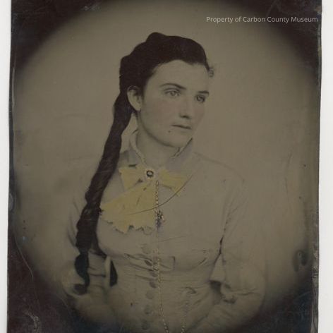 Update 1/2010: Black and white print with hand-colored accents. Tintype. Studio portrait. Printed on thin metal sheet. Half length portrait of a woman in a light-colored dress with buttons down front; yellow fabric bow at neck and light grey collar; gold and black broach on bow with gold chain running down to pocket watch in small pocket at her left waist. Her long dark hair is braided over her right shoulder. her cheeks and lips are rouged.