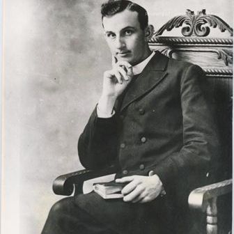 A black and white glossy print, 7 7/8 " x 9 7/8", of Joseph Conrath, ca. 1920. A shadow background shows with Mr. Conrath sitting in an ornate wooden chair with a decorative top back edge of a fleur de lis open cut wood design with his right arm propped on wooden chair arm rest, elbow bent and touching his side face with his forefinger. He has dark hair with side left part, dark eyes and is wearing a dark double breasted suit with stiff white collar showing under his jacket lapel. He is holding a small black book in his left hand which is laying on his left upper leg which is crossed over his right leg. His forefinger is placed inside the closed book marking his reading place. Fair condition with an opague line showing top to bottom on left side of print. Tiny black and white dots from developing process. Slight soiling, wear, and wrinkling on all edges with slight tear bottom left. Soiling and residue on backside. Many emulstion irregularities throughout print giving appearance of small flat blisters.Collection