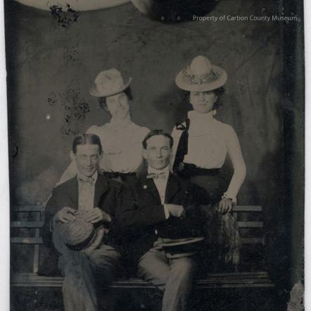 A tintype, 2 1/2" x 3 1/2," of a studio photo of two men seated side by side on an open slatboard type wooden bench with two women standing behind them, each with their outside arm resting on bench back edge at top. The men have dark hair, and are wearing dark jackets, white shirts, light color bowties and light colored pants. The man on the left is holding a light colored hat with both hands at top of brim and lower brim resting on his crossed legs. Man on right has his arms crossed across his chest and a flat hat resting upside down on his leg. The ladies have dark hair and are wearing white long sleeved blouses, dark skirts and light colored hats. The background scenery is not clear. At photo top edge is a white curtain? with a black circular object in center. Photo is in poor condition with wear, stains, residue and blemishes. Backside is copper colored.Collection