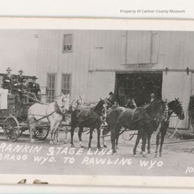 Update 2009: Black and white print card of stage and 6 horses. There are 5 men on top of stage, one holding reins of horses, two on seat beside him, tow more on upper seat. All wearing dark suits, ties, white shirts, and hats . Four more men and a child are behind horses beside building in the background. Two more heads are seen in window in building. The building has a wide side roll opening. Stage has canvas covering over passenger area. Four lead horses are dark and have fancy harness on their head and chest. Two horses close to wagon are light colored . printed on bottom in white ink on original negative: "Rankin STAGE LINE" Bragg [sic BAGGS] Wyo to Rawling [sic Rawlins] WYO 105". Photo taken on 100 block of 5th street. Written on back in black: "Copied by State, mounted." "Scenes" Surrounded by lines on 3 sides. Stamped with: "Neg No 6649 Print No. 100." Printed in black: "Post Card" "Address" Square with: "Place Stamp Here". Condition good. back soiled, front accretion, creased, scratched, edges and corners worn.Collection